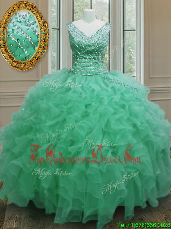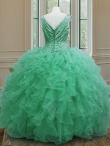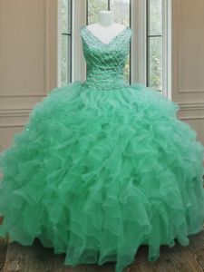 V-neck Sleeveless Zipper 15 Quinceanera Dress Apple Green Organza