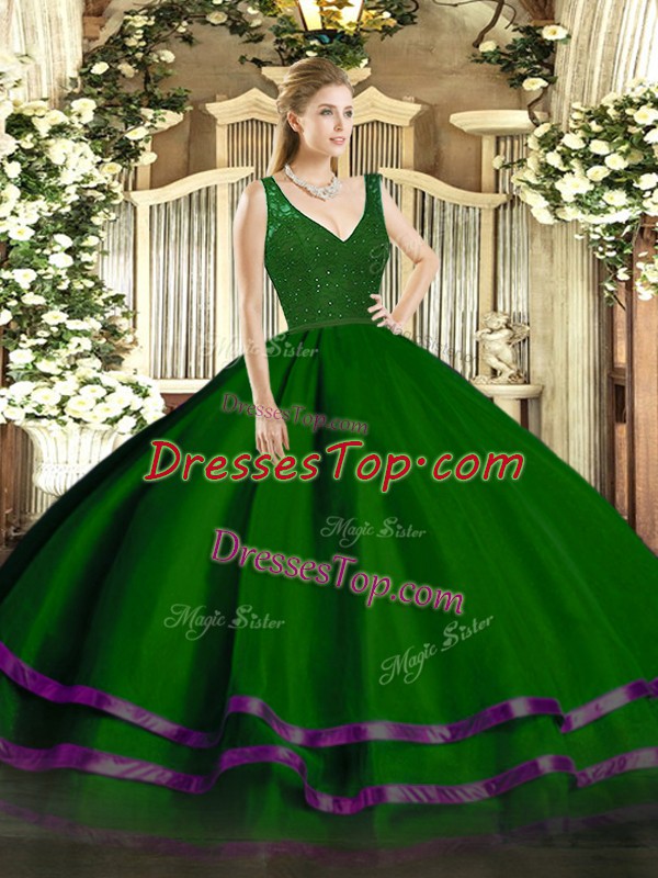 V-neck Sleeveless Zipper 15th Birthday Dress Green Tulle