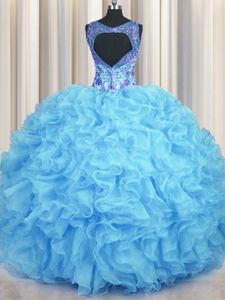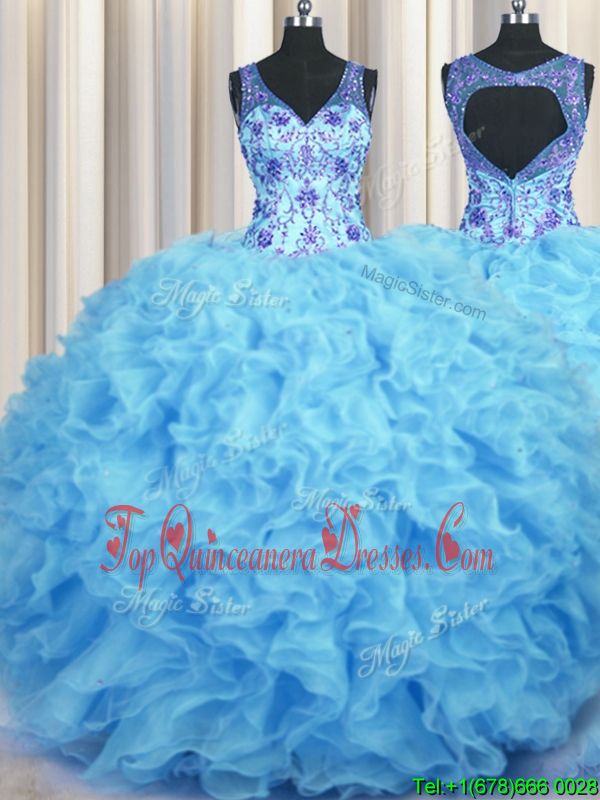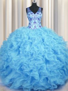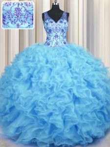 V Neck Sleeveless Zipper Floor Length Beading and Appliques and Ruffles Ball Gown Prom Dress