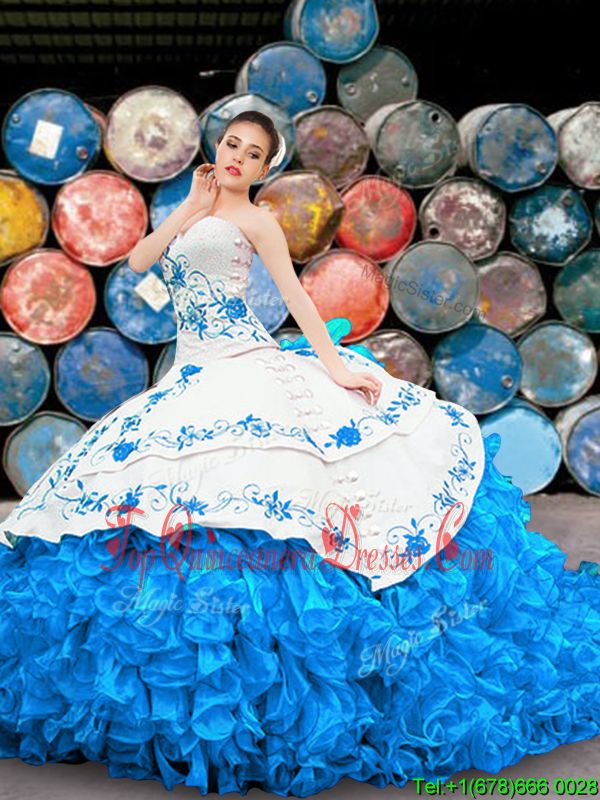 Vintage Blue And White Ball Gowns Organza Halter Top Sleeveless Appliques and Embroidery and Ruffles Floor Length Lace Up 15 Quinceanera Dress