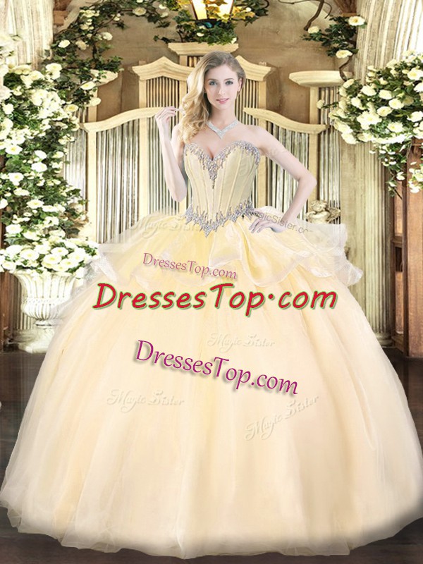 Vintage Champagne Ball Gowns Organza Sweetheart Sleeveless Beading Floor Length Lace Up 15th Birthday Dress