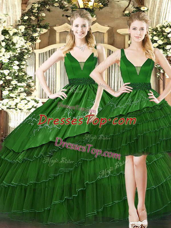 Vintage Dark Green Tulle Lace Up Straps Sleeveless Floor Length 15 Quinceanera Dress Beading and Ruffled Layers