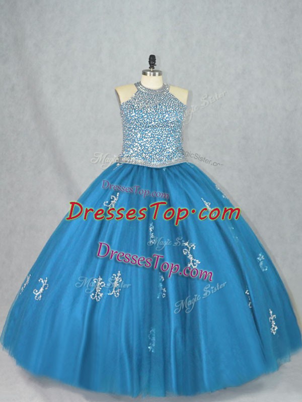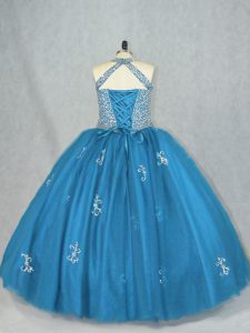 Vintage Floor Length Blue Sweet 16 Dress Tulle Sleeveless Beading and Appliques