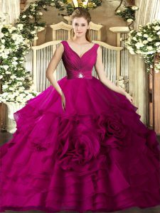 Vintage Fuchsia V-neck Neckline Beading and Ruffles Quinceanera Dresses Sleeveless Backless