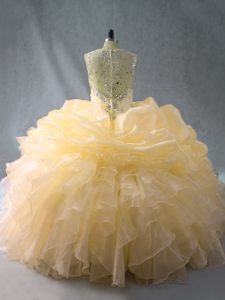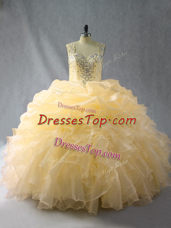 Vintage Gold Organza Zipper Straps Sleeveless Floor Length 15 Quinceanera Dress Beading and Ruffles