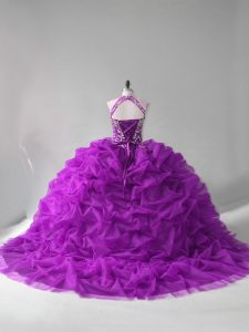 Vintage Purple Halter Top Lace Up Beading and Pick Ups Ball Gown Prom Dress Court Train Sleeveless