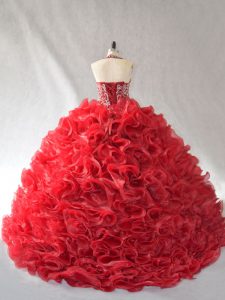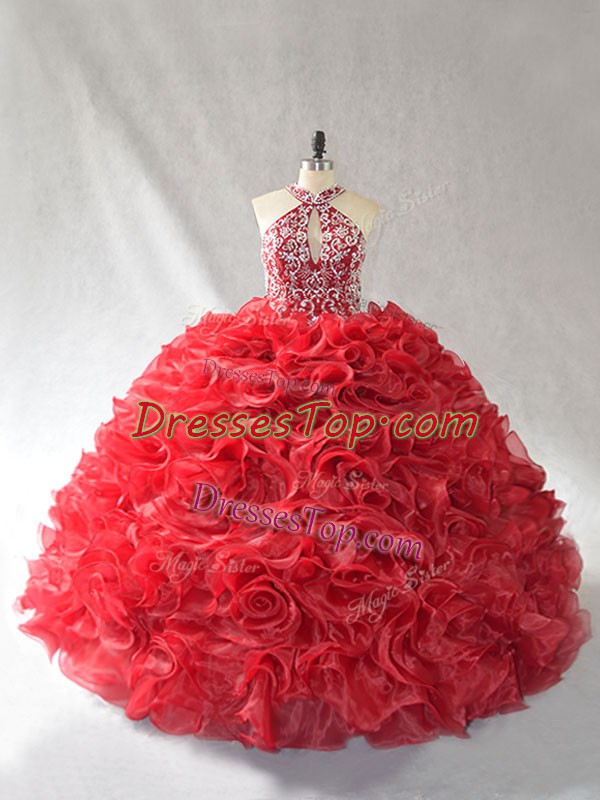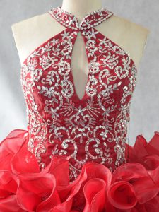 Vintage Red Ball Gowns Organza Halter Top Sleeveless Beading and Ruffles Lace Up 15th Birthday Dress Brush Train