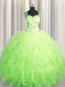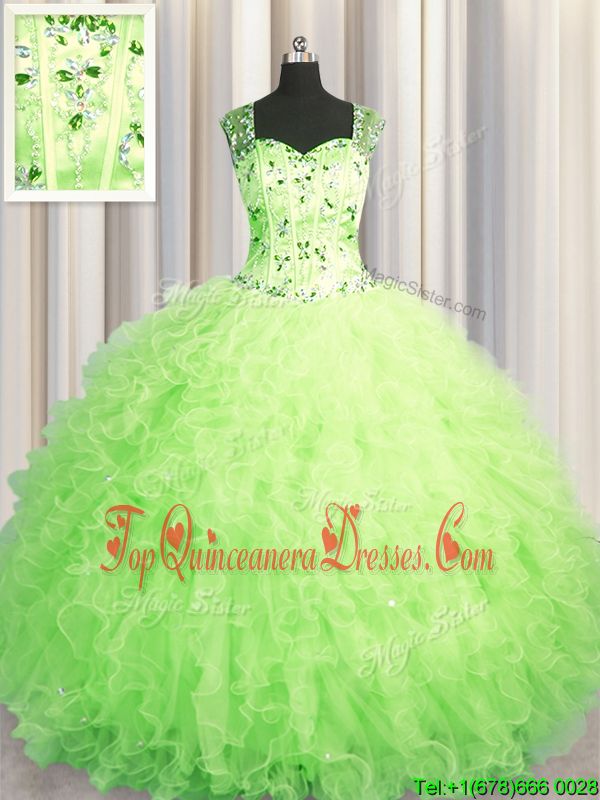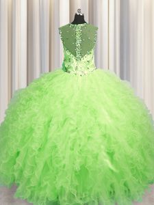 Vintage See Through Zipper Up Green Sleeveless Tulle Zipper Vestidos de Quinceanera for Military Ball and Sweet 16 and Quinceanera