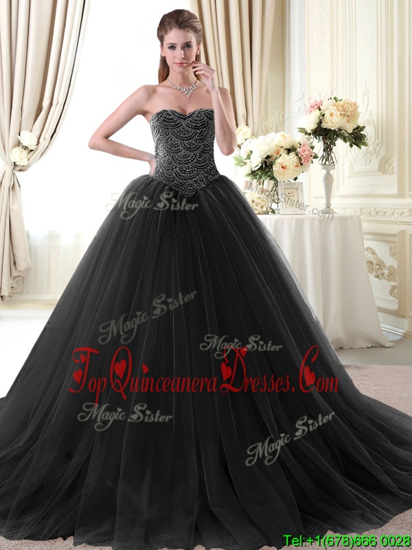 Vintage Tulle Sweetheart Sleeveless Lace Up Beading Ball Gown Prom Dress in Black