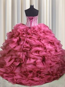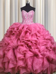 Visible Boning Bling-bling Rose Pink Ball Gowns Sweetheart Sleeveless Organza With Brush Train Lace Up Beading and Ruffles 15 Quinceanera Dress