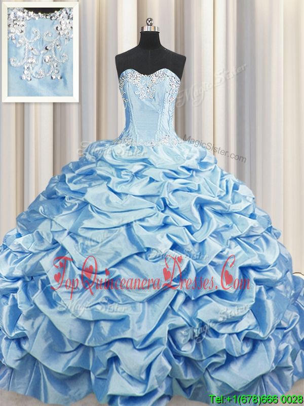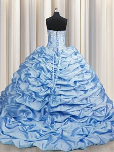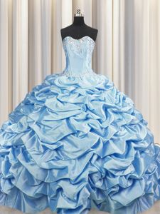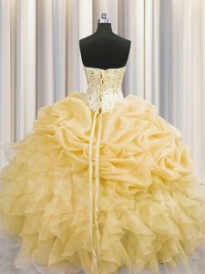 Visible Boning Floor Length Blue Quince Ball Gowns Organza Sleeveless Beading and Ruffles and Pick Ups
