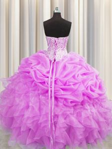 Visible Boning Lilac Sweetheart Lace Up Beading and Ruffles and Pick Ups Quince Ball Gowns Sleeveless