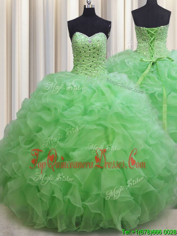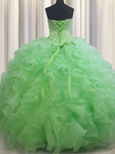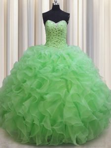 Visible Boning Olive Green Ball Gowns Sweetheart Sleeveless Organza With Brush Train Lace Up Beading and Ruffles Quince Ball Gowns
