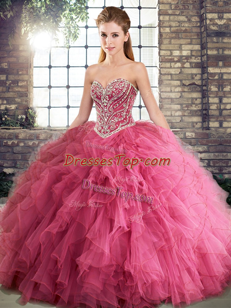 Watermelon Red Ball Gowns Beading and Ruffles Quinceanera Gowns Lace Up Tulle Sleeveless Floor Length