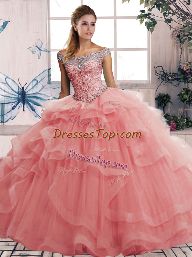 Watermelon Red Lace Up Off The Shoulder Beading and Ruffles Sweet 16 Dresses Tulle Sleeveless