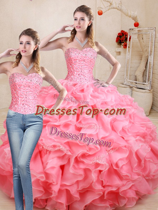 Watermelon Red Lace Up Quince Ball Gowns Beading and Ruffles Sleeveless Floor Length