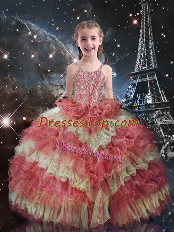 Watermelon Red Lace Up Straps Beading and Ruffled Layers Girls Pageant Dresses Organza Short Sleeves