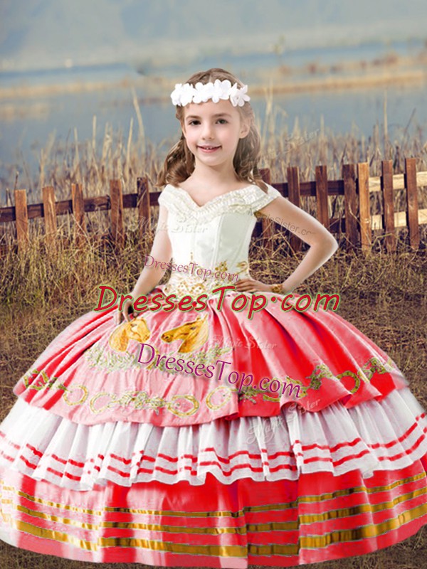 Watermelon Red Satin Lace Up Kids Pageant Dress Sleeveless Floor Length Embroidery