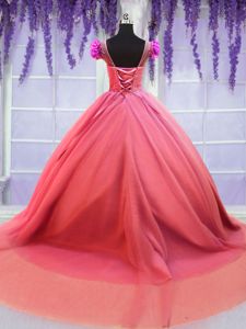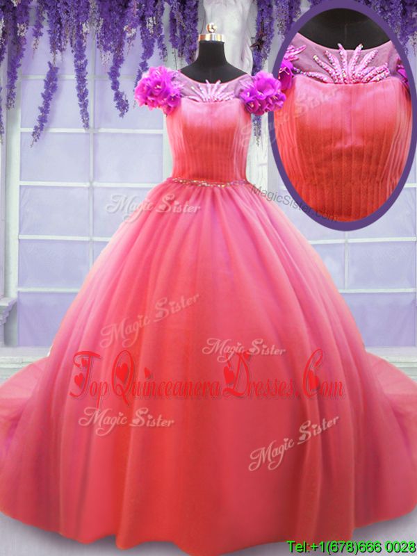 Watermelon Red Scoop Neckline Hand Made Flower Sweet 16 Dresses Short Sleeves Lace Up