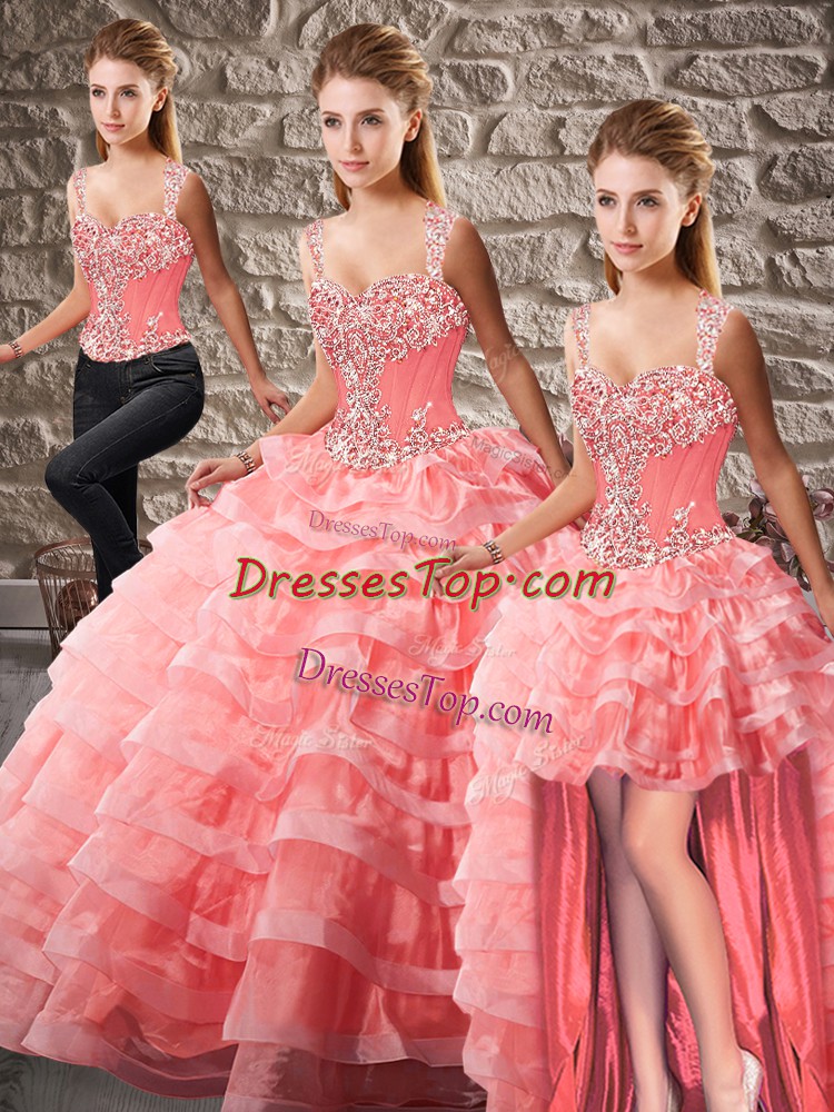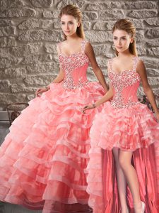 Watermelon Red Sleeveless Beading and Ruffled Layers Lace Up Sweet 16 Dress
