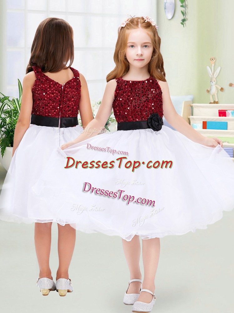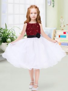 White A-line Scoop Sleeveless Organza Knee Length Zipper Sequins and Hand Made Flower Child Pageant Dress
