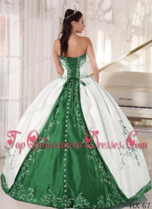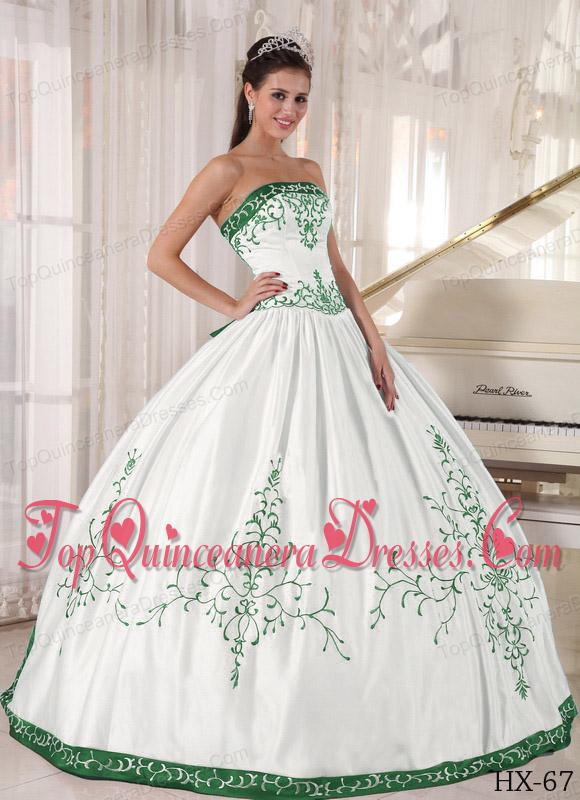 White and Green Strapless Floor-length Embroidery Quinceanera Dress