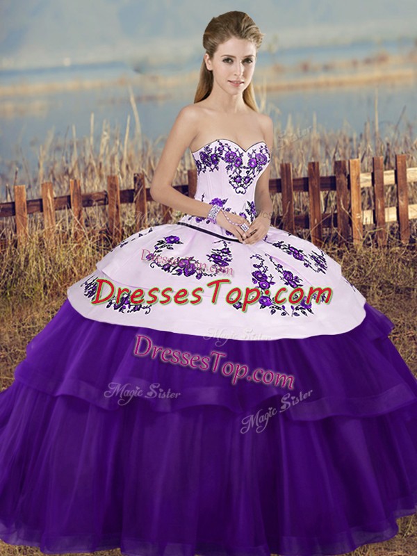 White And Purple Lace Up Quinceanera Gowns Embroidery and Bowknot Sleeveless Floor Length