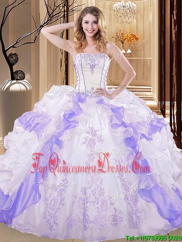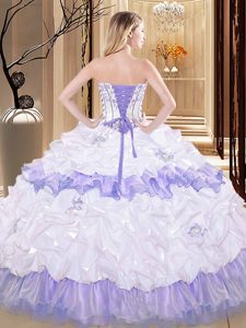 White And Purple Organza Lace Up Quince Ball Gowns Sleeveless Floor Length Embroidery and Ruffled Layers