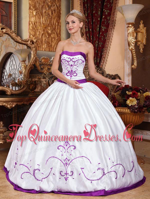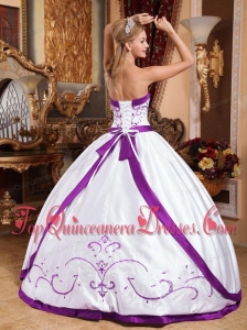 White and Purple Strapless Floor-length Satin Embroidery Fashionable Quinceanera Dress