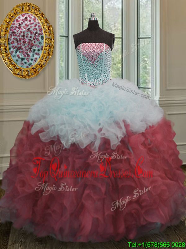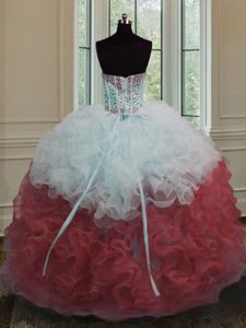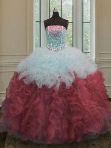 White And Red Ball Gowns Strapless Sleeveless Organza Floor Length Lace Up Beading and Ruffles Quinceanera Gowns