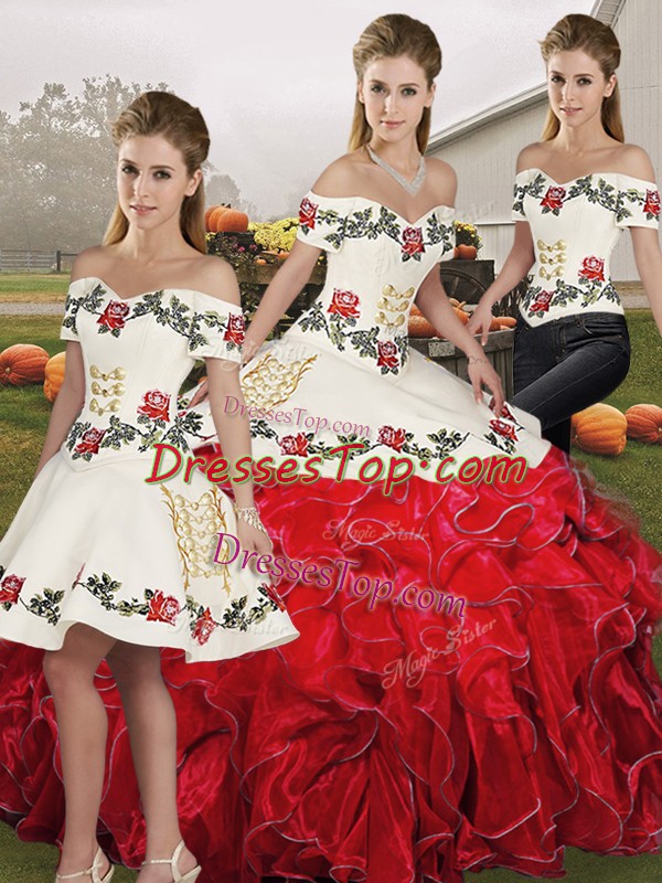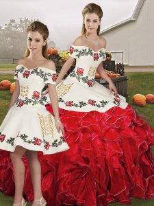 White And Red Lace Up Vestidos de Quinceanera Embroidery and Ruffles Sleeveless Floor Length
