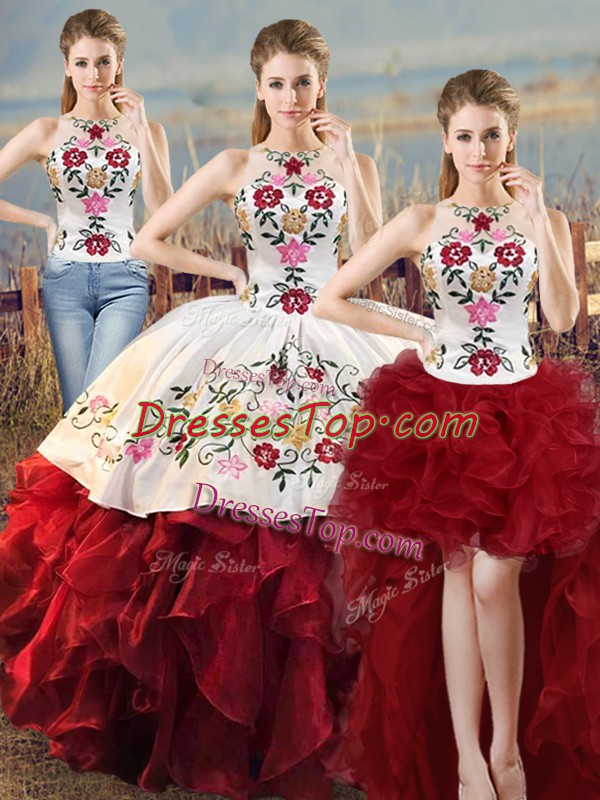 White And Red Organza Lace Up Quinceanera Gown Sleeveless Floor Length Embroidery and Ruffles