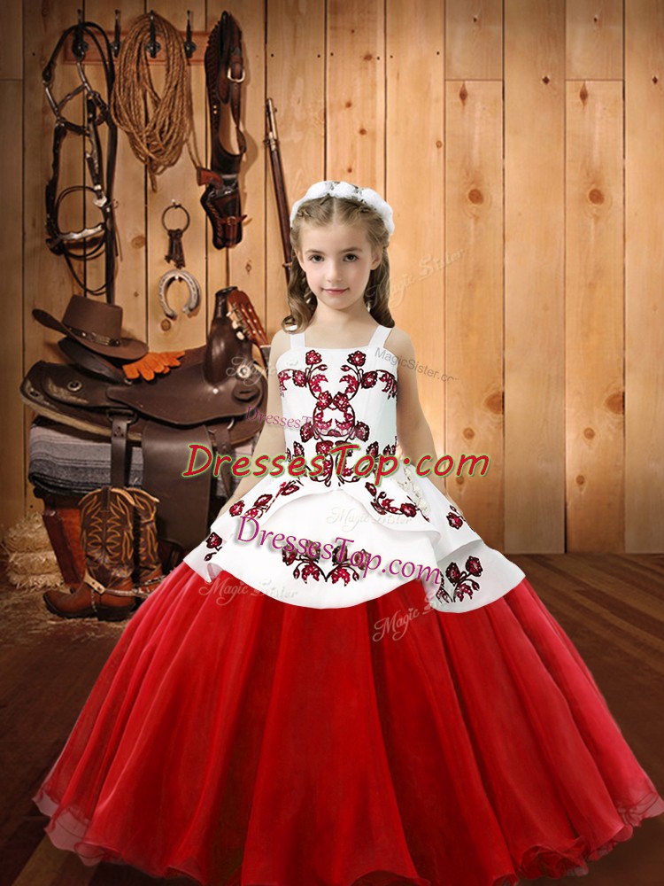 White And Red Sleeveless Floor Length Embroidery Lace Up Winning Pageant Gowns