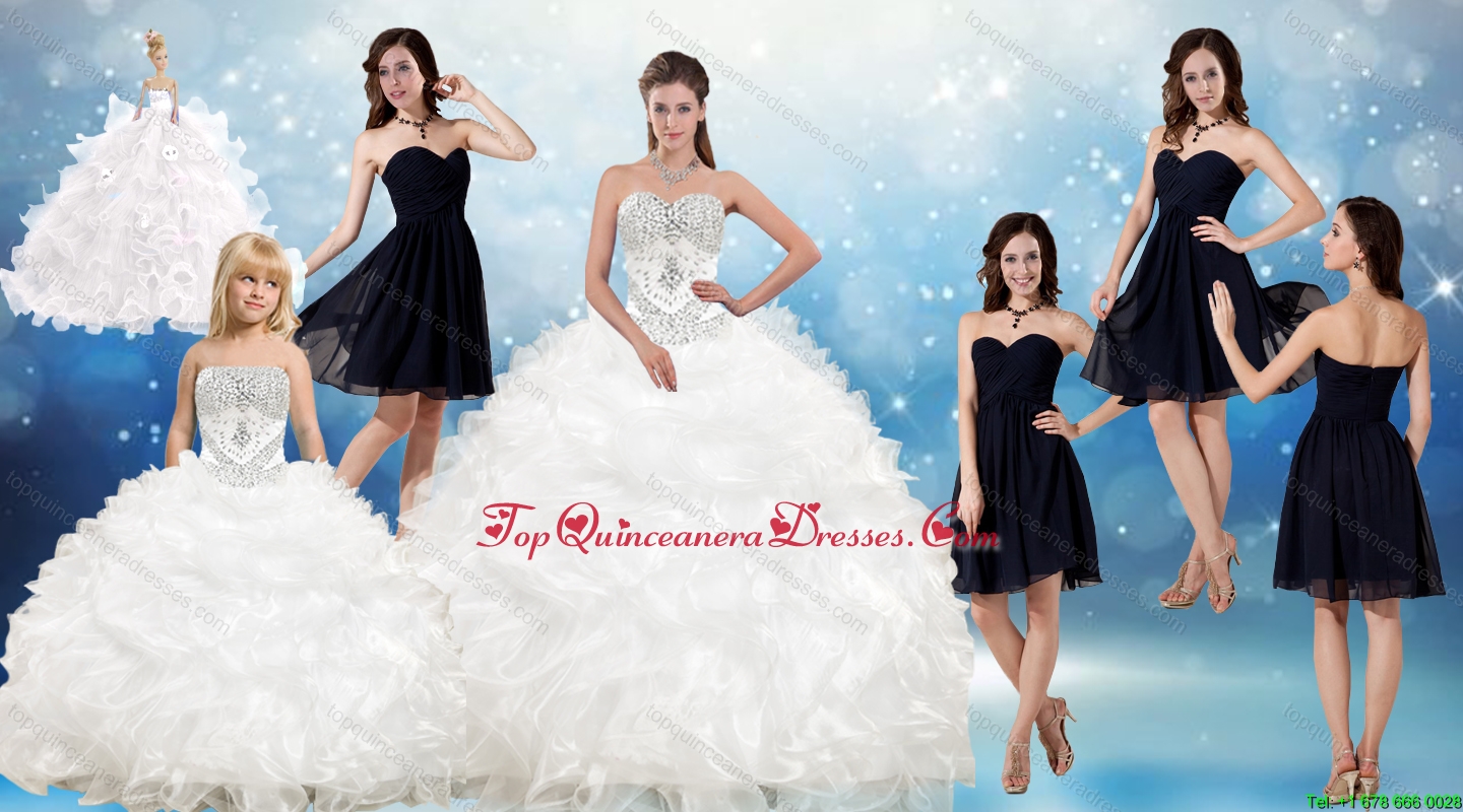 White Ball Gown Quinceanera Dress and Black Sweetheart Short Dama Dresses and Beading and Ruffles Little Girl Dress
