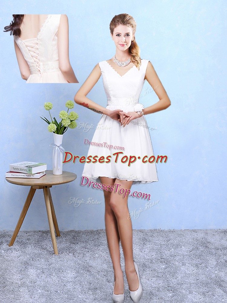White Chiffon Lace Up V-neck Sleeveless Mini Length Quinceanera Court of Honor Dress Lace