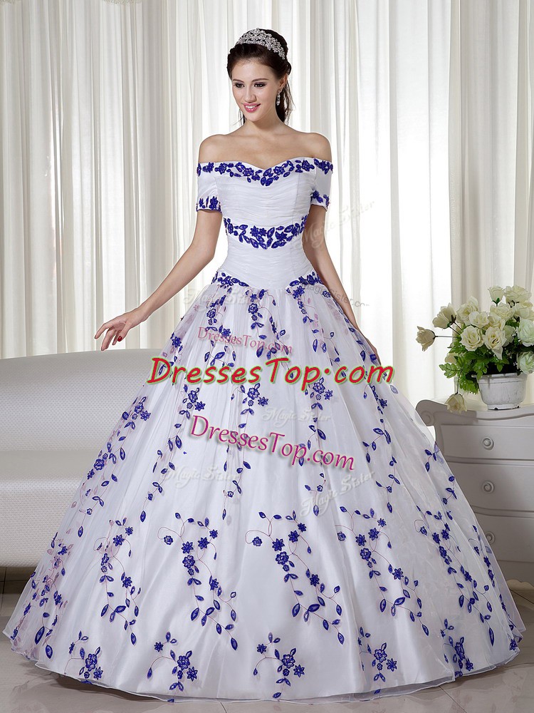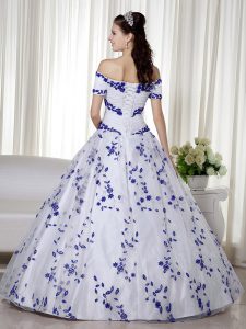 White Lace Up Off The Shoulder Embroidery 15th Birthday Dress Organza Short Sleeves