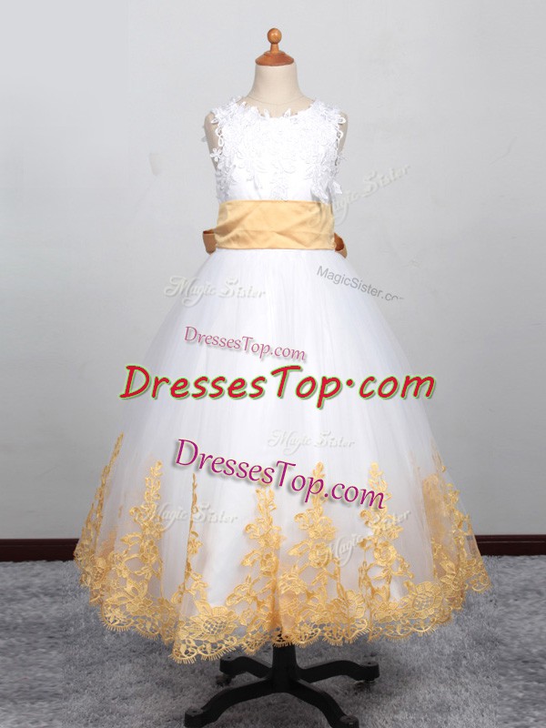 White Lace Up Scoop Appliques Little Girls Pageant Gowns Tulle Sleeveless