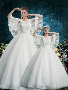 White Scoop Lace Up Lace Vestidos de Quinceanera Half Sleeves
