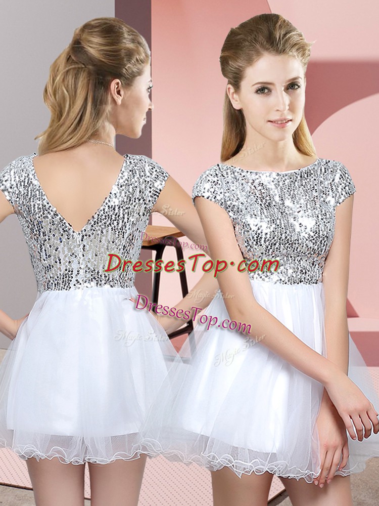White Scoop Zipper Sequins Quinceanera Court of Honor Dress Cap Sleeves