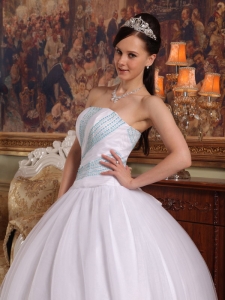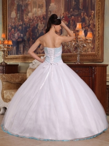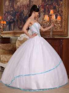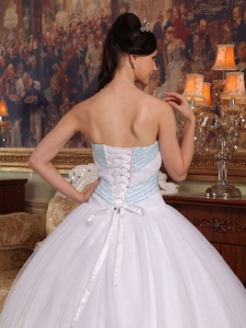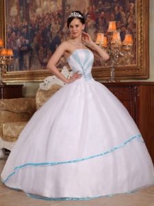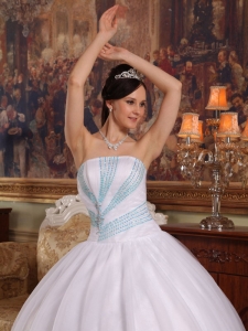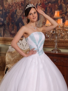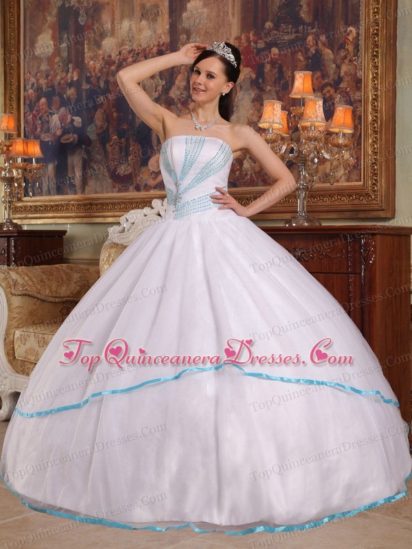 White with Blue Trim Strapless Quinceanera Dress Beading