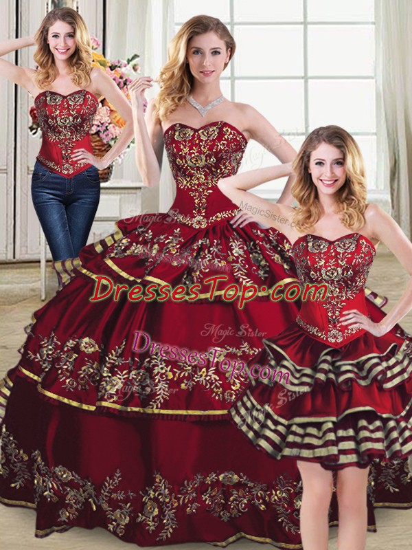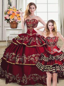 Wine Red Ball Gowns Sweetheart Sleeveless Organza Floor Length Lace Up Embroidery and Ruffled Layers 15th Birthday Dress