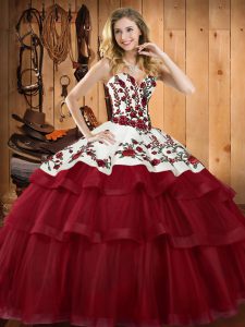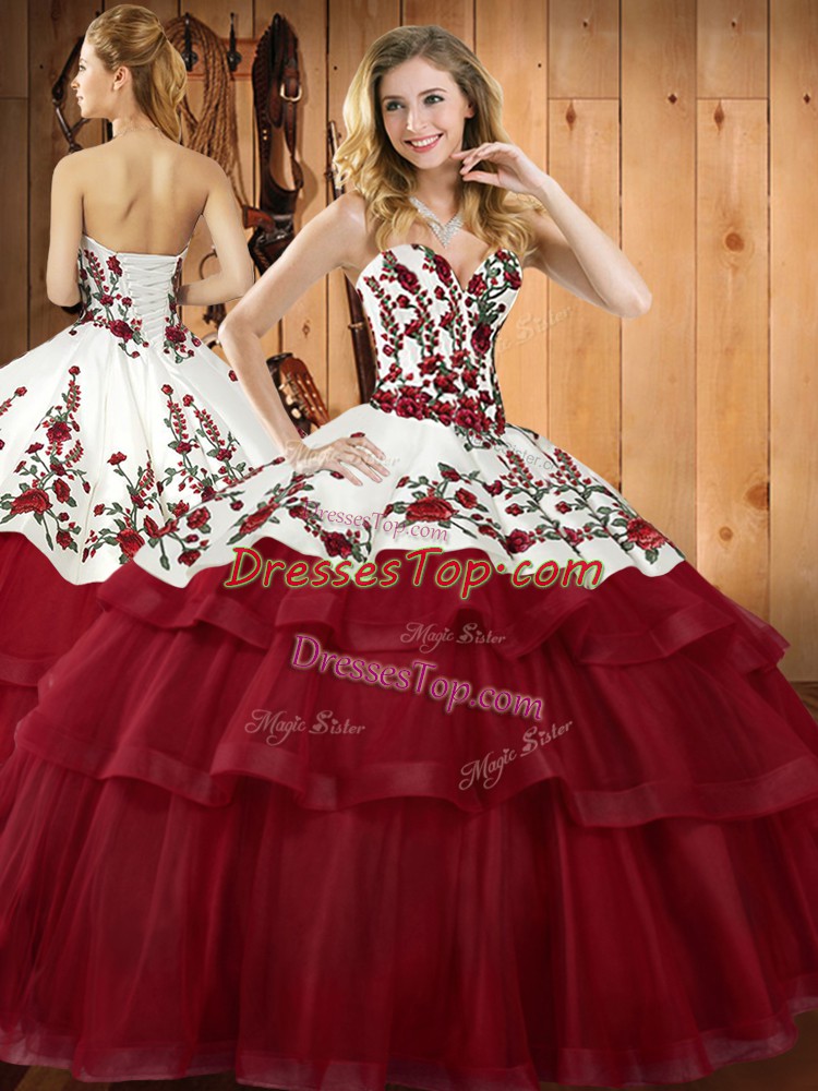 Wine Red Ball Gowns Sweetheart Sleeveless Organza Sweep Train Lace Up Embroidery 15th Birthday Dress