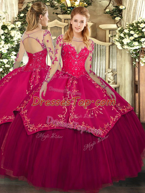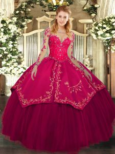 Wine Red Lace Up Scoop Lace and Embroidery 15th Birthday Dress Organza and Taffeta Long Sleeves