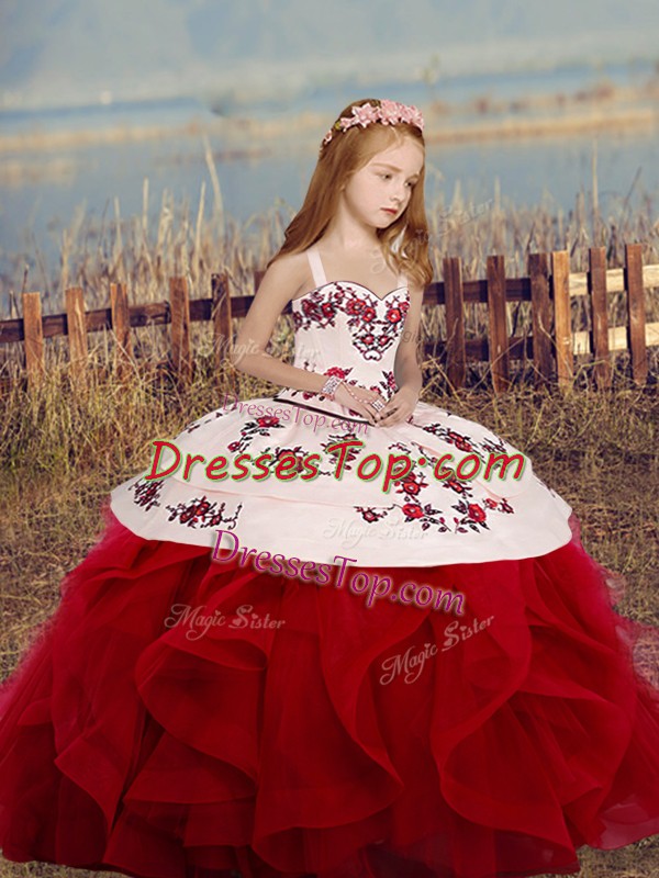 Wine Red Lace Up Straps Embroidery and Ruffles Little Girls Pageant Dress Sleeveless