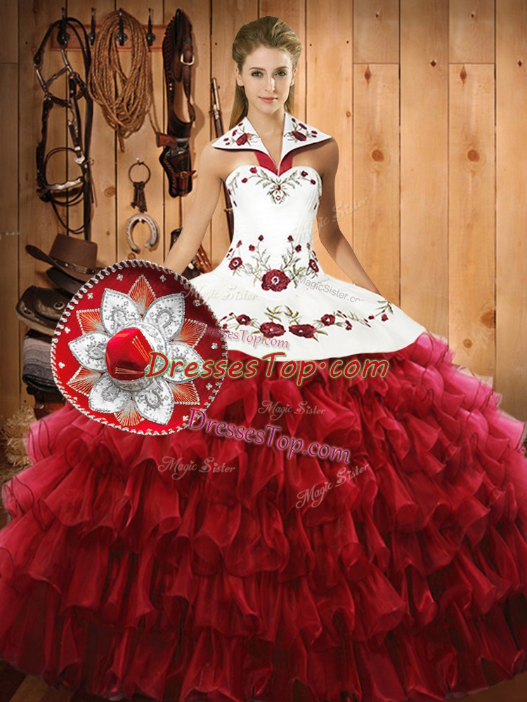 Wine Red Lace Up Sweet 16 Dress Embroidery and Ruffled Layers Sleeveless Floor Length