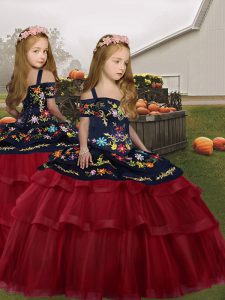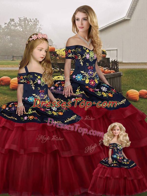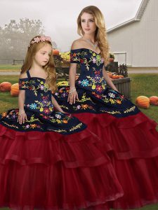 Wine Red Off The Shoulder Neckline Embroidery and Ruffled Layers Quinceanera Gown Sleeveless Lace Up