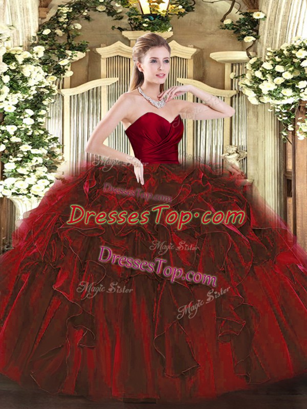 Wine Red Organza Zipper Sweetheart Sleeveless Floor Length Quinceanera Gown Ruffles