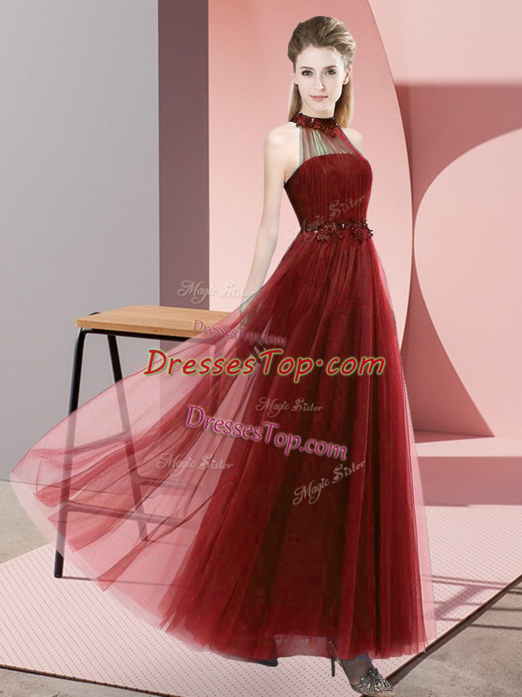 Wine Red Sleeveless Tulle Lace Up Dama Dress for Wedding Party