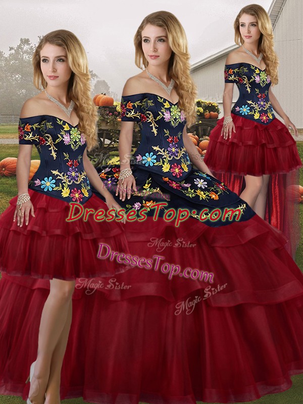 Wine Red Sweet 16 Dress Tulle Brush Train Sleeveless Embroidery and Ruffled Layers