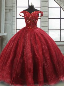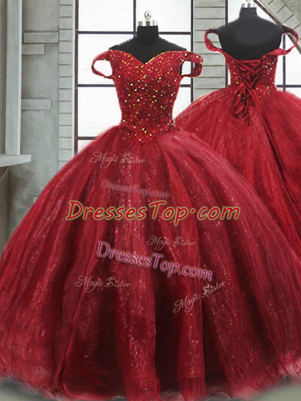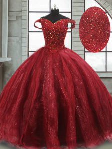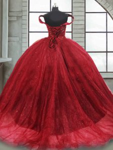 Wine Red Sweet 16 Dresses Military Ball and Sweet 16 and Quinceanera with Beading Off The Shoulder Sleeveless Brush Train Lace Up